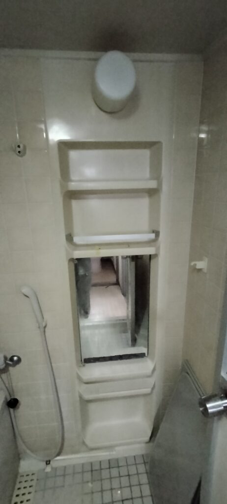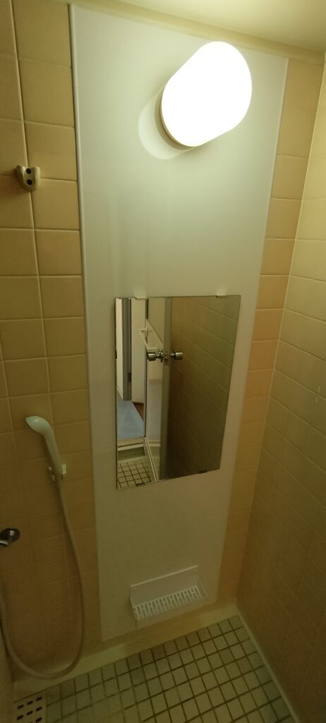 ユニットバスの壁に埋込されているキャビネットのプラスチック部が破損しておりました。補修が難しいため、一旦解体してパネルを取付けました(照明は既存使用、鏡は新規、シャンプー置き新規)